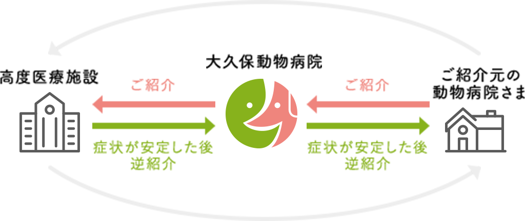 当院では、高度医療施設及び近隣の動物病院様と連携し、よりご家族のご希望に沿える医療体制の実現を目指しています。高度医療が必要な症例は高度医療施設へご紹介し、病状が安定した後、当院で治療を継続するというネットワークを構築しています。