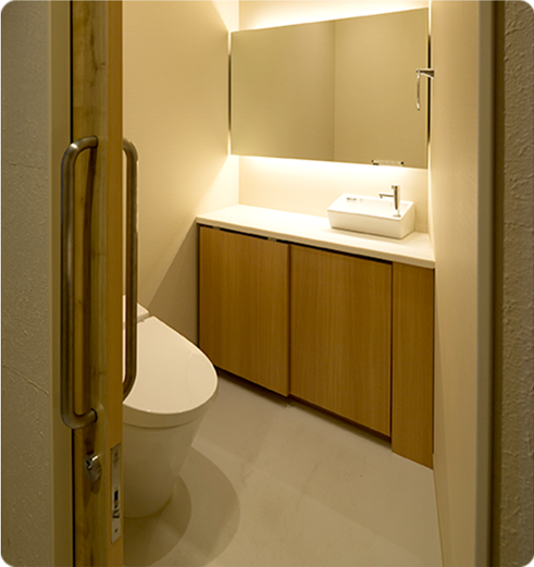 - 仕切りのない大きなガラス面で、開放的な空間を演出しています。内装は和紙を使用し、吸湿・乾燥・防臭等の和紙が持つ機能を利用して、待ち時間を快適に過ごしていただけるよう配慮しました。